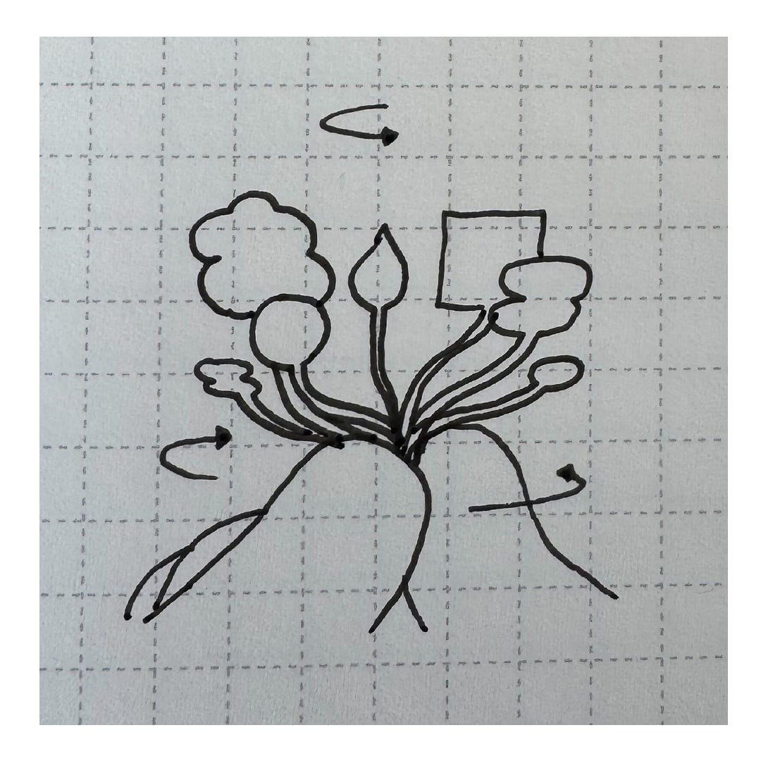 Seth’s feedback shifted me towards adding a more human element interacting with the flowers. I like pushing scale, so I thought about a gardener turning a tiny vase of flowers between their fingers.